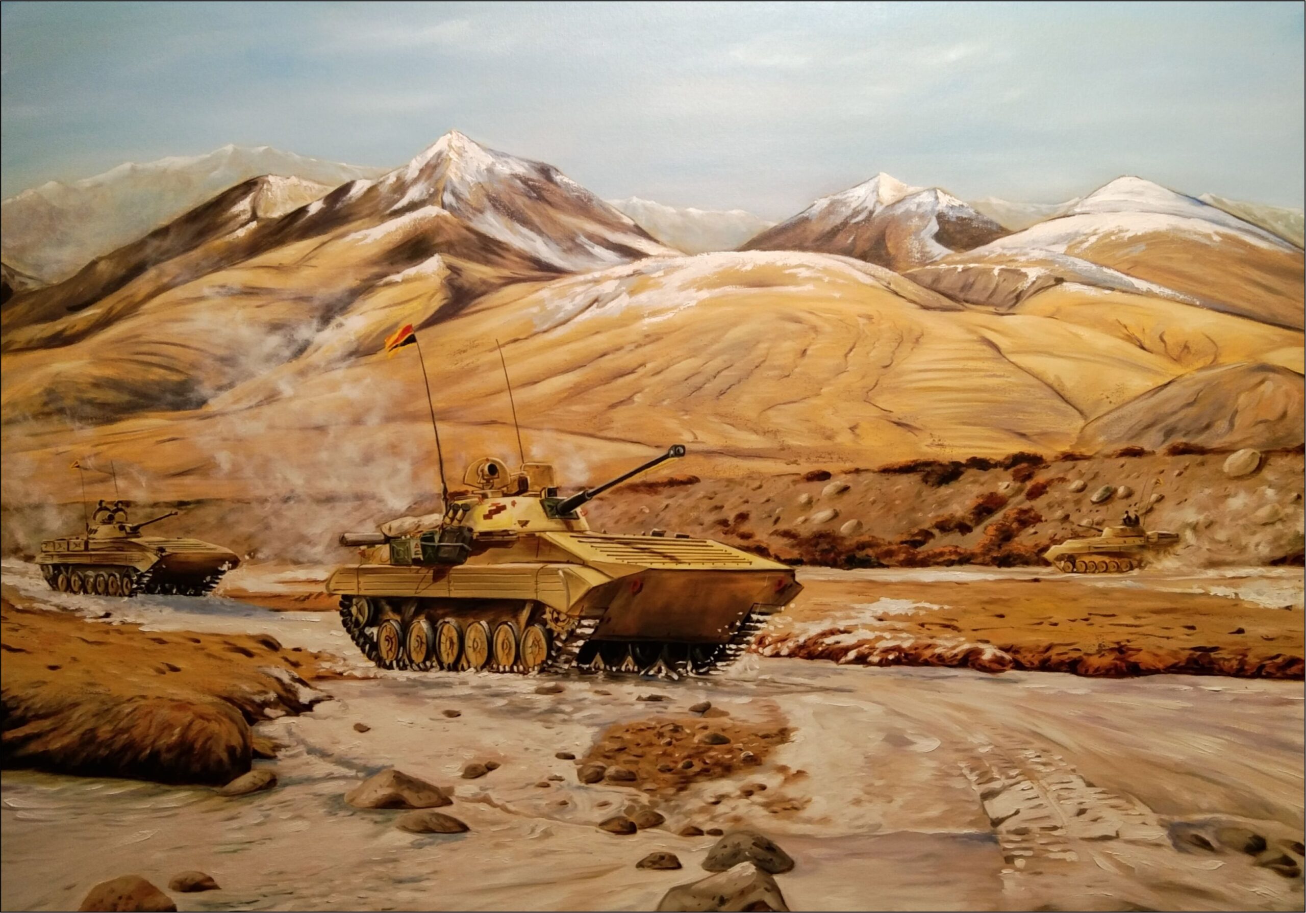 This paintng is about BMP-2 Infantry Combat Vehicle is very effective which is known as APC Sarath is deployed by Indian Army at the borer of Tibet to tackle China . It is fully tracked ambhibian ICV with 30mm automatic cannon.Its range is 4km. antitank wire guided ‘Konkurs’ missile housing 7 troopers and 3 crews. Artist has depicted the real atmosphere of Ladakh in this painting with the reference from his own posting and experience of the indo-sino border .